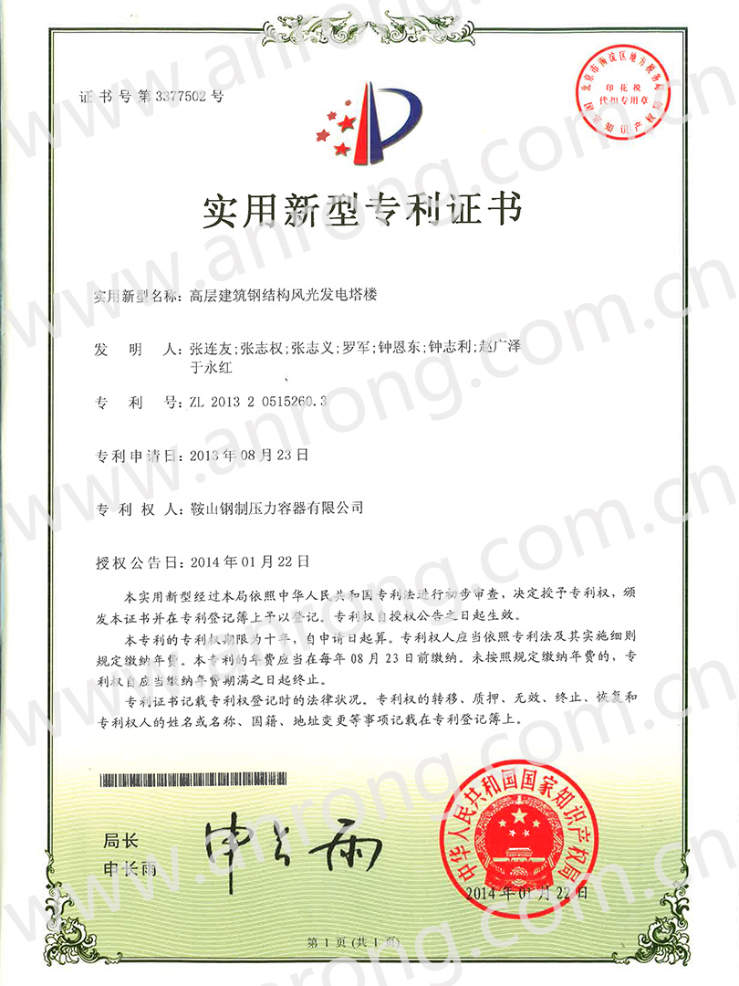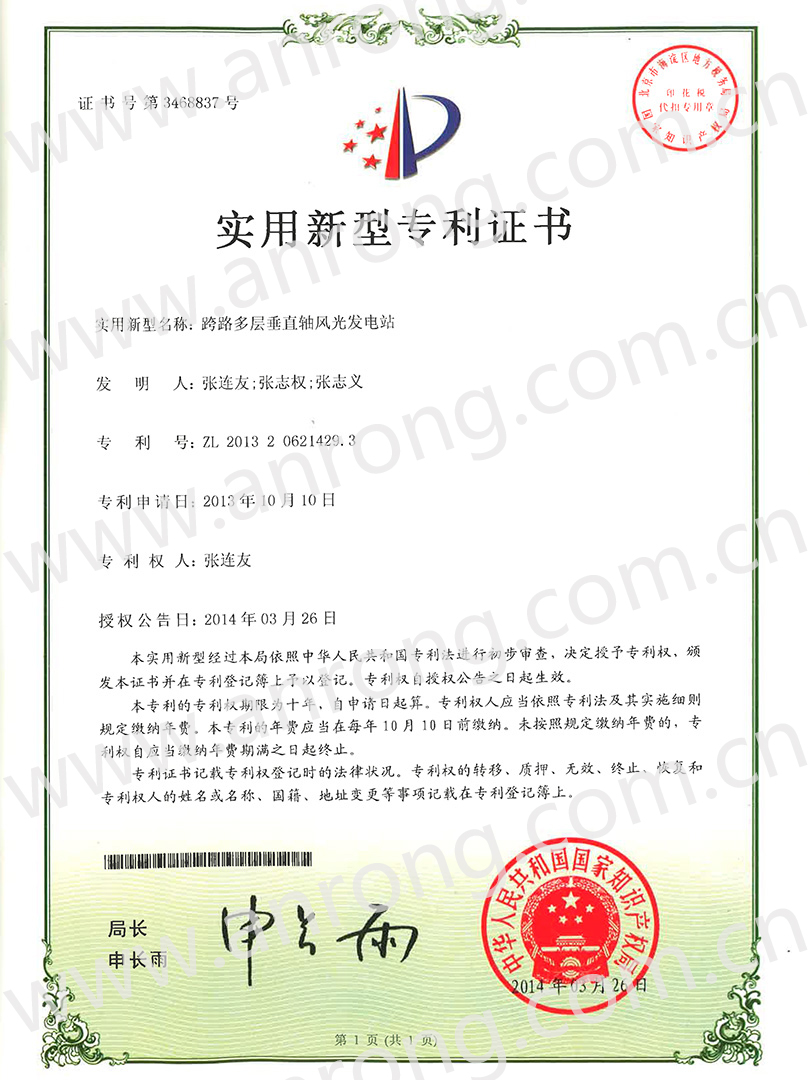 跨路多層垂直軸風(fēng)光發(fā)電站-專(zhuān)利證書(shū)